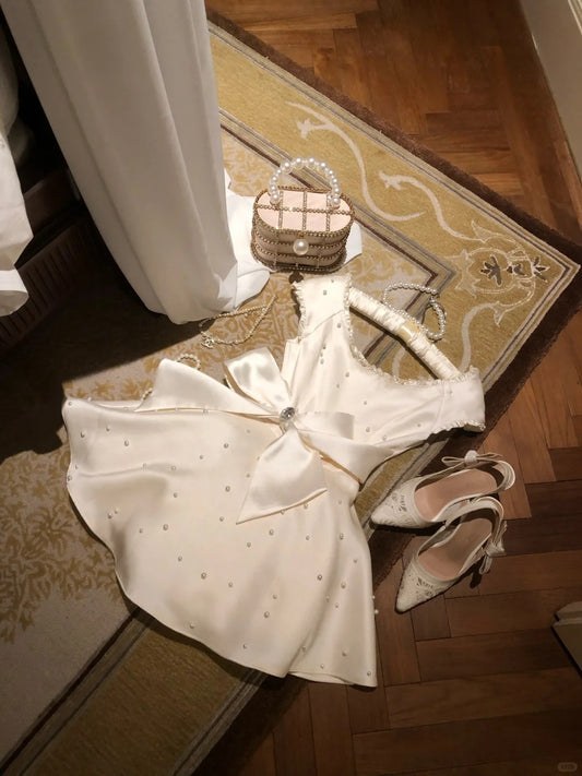 White Elegant Exquisite Beaded Short Satin Princess Homecoming Dress Prom Dress Evening Dress Party Dress nv4129