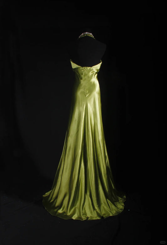 Green Vintage Elegant Exquisite Beading Long Satin Floor Length Train Ball Gown Evening Gown Party Dress nv4121