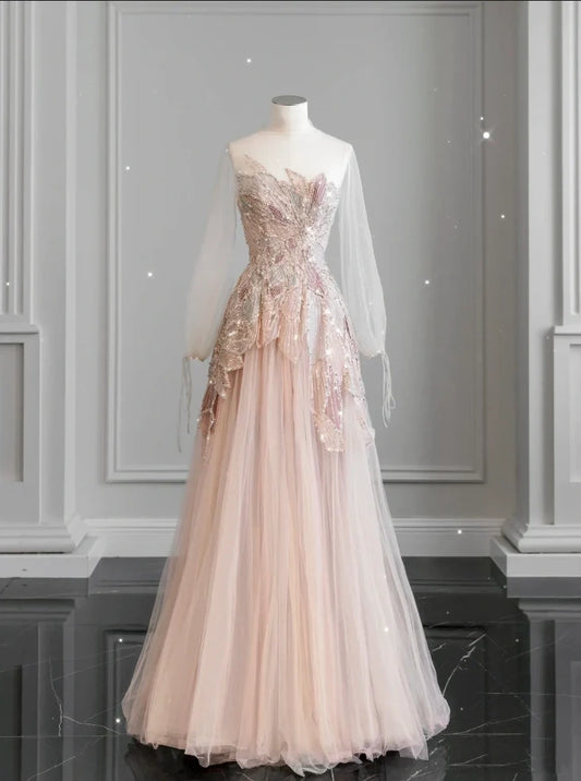 Pink Sweet Sparkling Off-the-shoulder Beaded Long Elegant Tulle Formal Prom Dress Evening Gown nv3475