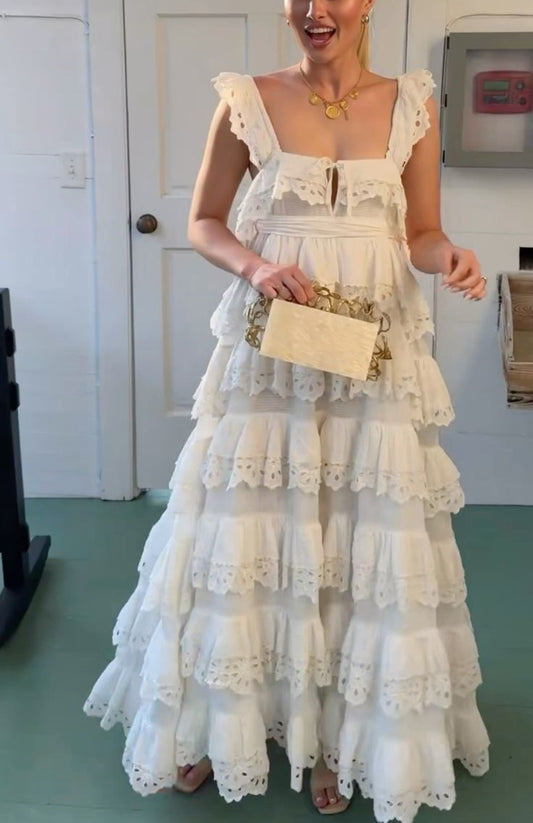 White exquisite elegant lace long ruffled tulle ball gown evening dress party dress nv3362