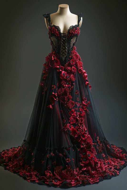 Black vintage red Exquisite beads rose floral applique long tulle elegant long ball gown evening dress nv3343