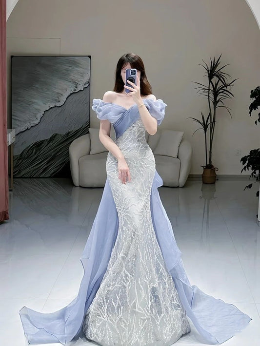 Blue shiny sequined Beads long mermaid slim elegant tulle ball gown evening dress party dress nv3251