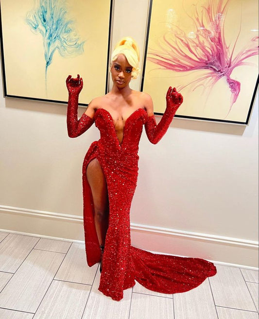 Red/Pink Shiny Sequins Elegant V-Neck Long Slit Sexy Ball Gown Evening Dress Party Dress With Gloves nv3241