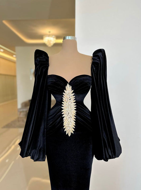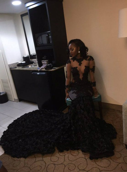 Black sexy elegant mermaid see-through long tail long sleeve ruffled ball gown evening dress nv3227