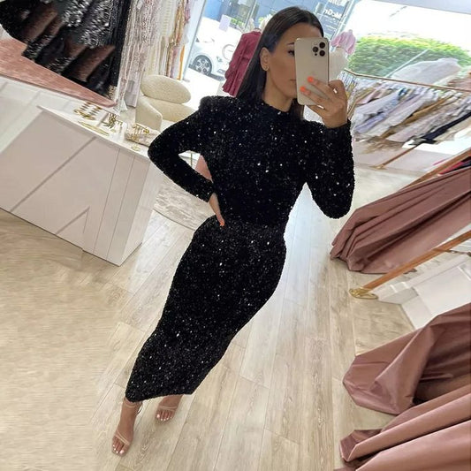 Black shiny sequins long sleeves prom dress evening dress party dress nv3193