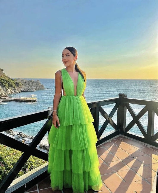 Green Elegant A-Line V-Neck Layered Tulle Ball Gown Evening Dress nv3100
