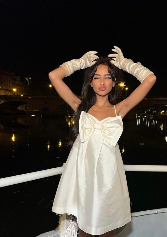 White youthful pure simple cute sweetheart elegant sling big bow short mini satin off the shoulder ball gown evening dress birthday party dress homecoming dress with gloves nv2558