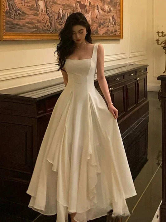 White Elegant Irregular Hem Long Ball Gown Evening Dress A-Line Square Neck Ball Gown Ankle Length nv2007