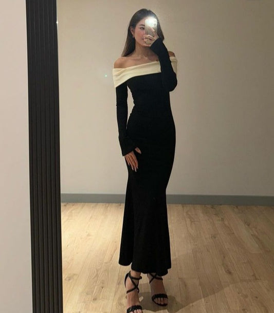 Black solid contrast off-the-shoulder one-step skirt ball gown evening dress nv1939