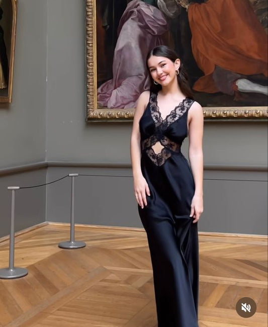 Black Elegant Lace Satin Long Dress Evening Gown Prom Dress Party Dress nv1809