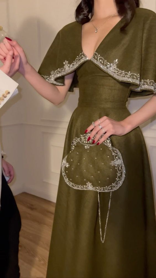 Olive Vintage Embroidery V Neck Long Dress Cape Short Sleeves Ball Gown Evening Dress nv1808