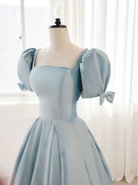 A-Line Blue Satin Puffy Sleeve Long Prom Dress, Blue Formal Dresses nv1726