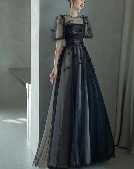Black Tulle Puffy Short Sleeves A-Line Prom Dress, Black Evening Dress Party Dress nv1698