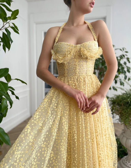 Yellow A-line Lace Prom Dress Backless Ankle Length Evening Dress Corset Party Graduation Dress nv1675