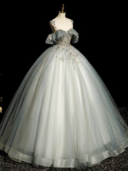 A-Line Round Neck Tulle Gray Blue Long Prom Dress, Tulle Sequin Lace Long Evening Dress nv1495