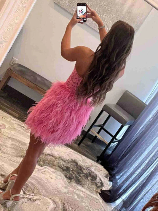 Strapless Beaded Burgundy/Pink/Black Lace Feather Short Prom Dresses, Burgundy/Pink/Black Lace Homecoming Dresses, Burgundy/Pink/Black Formal Graduation Evening Dresses nv1480