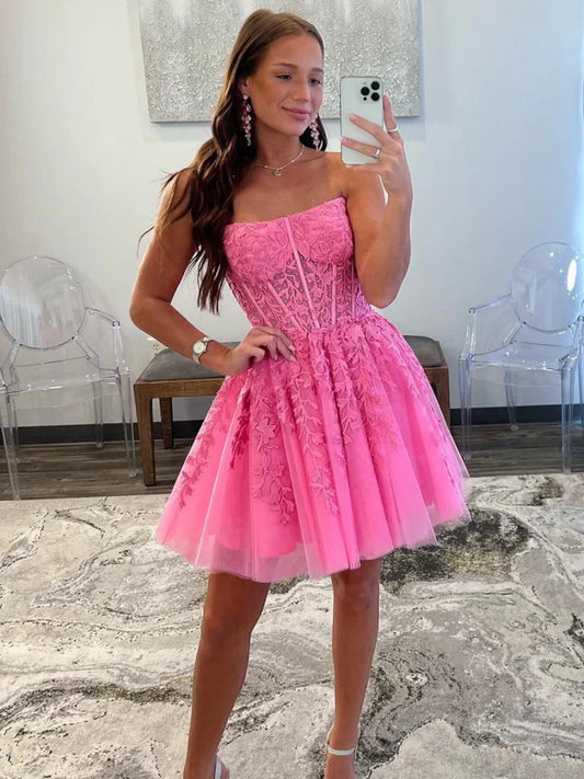 Strapless Hot Pink Lace Prom Dresses, Hot Pink Lace Homecoming Dresses, Short Hot Pink Formal Graduation Evening Dresses nv1487