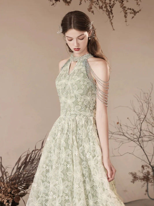 Cute Tulle Flower Floor Length Green Prom Dress, Beautiful Backless A-Line Evening Party Dress nv1414