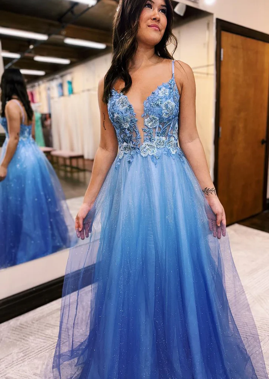 Hot Sexy A Line Spaghetti Straps Blue Long Prom/Evening Dresses nv1002