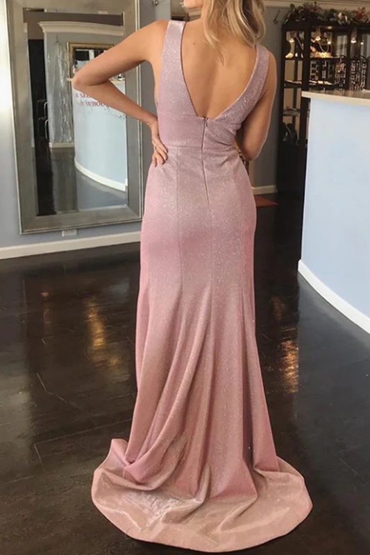Straps V Neck Sheath Maxi Prom Dress with Slit Fuchsia Silver Formal Evening Gown nv806