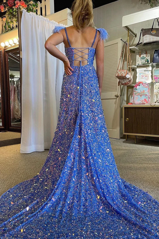 Mermaid Spaghetti Straps Royal Blue Sequins Long Prom Dress with Split Front nv678