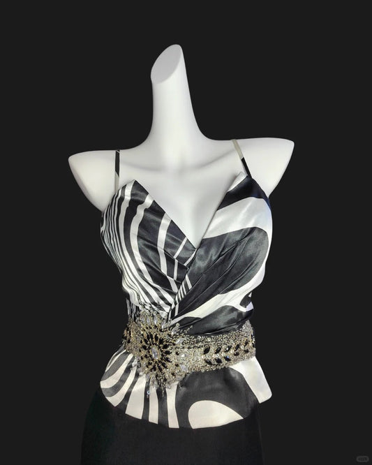 Vintage black and white elegant spaghetti strap long satin prom dress evening dress nv5232