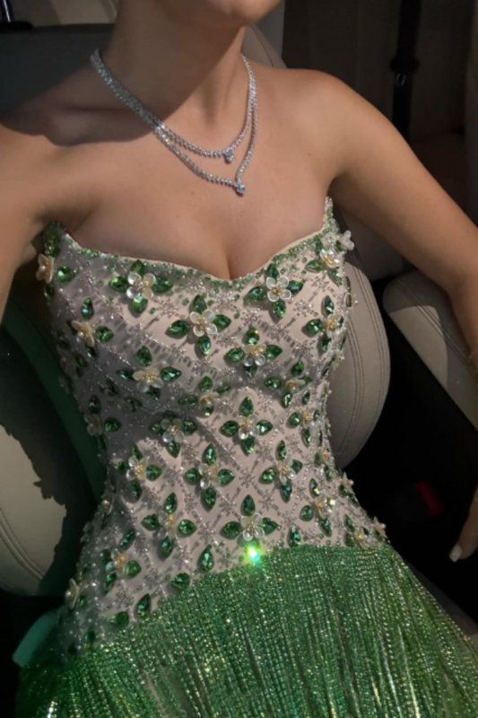 Green gorgeous shiny elegant beaded embellishment long tulle ball gown evening dress wedding guest dress nv2793