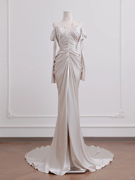 Champagne white fashionable and elegant mermaid tight long sleeves long satin trailing Prom Dress evening dress nv4971