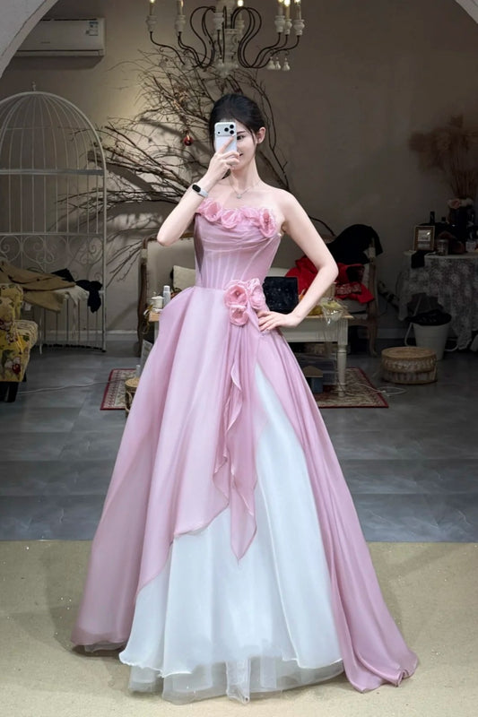 Sweet Element Style Strapless Sleeveless Gown | Pink-White Paneled Tulle 3D Flower Ballgown Maxi Dress for Engagement Luxury Dinner Garden Party NV6273