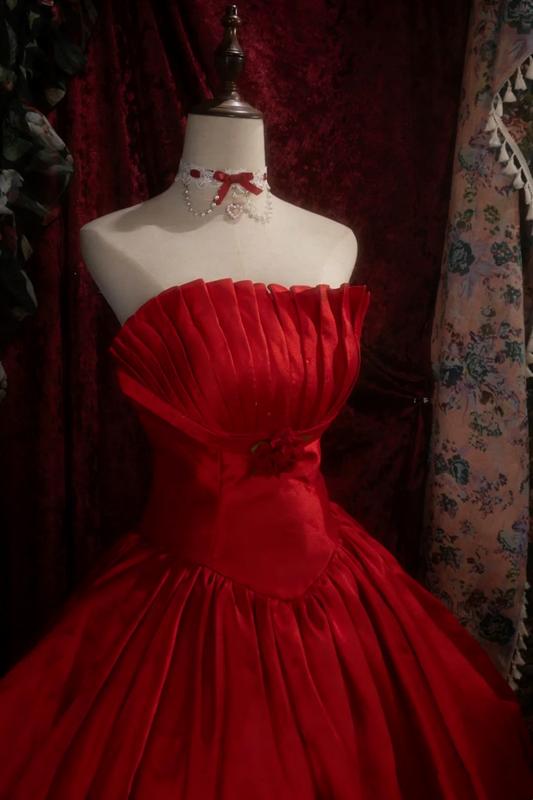 Vintage Scarlet Strapless Ball Gown with Rose Appliques, Satin Wedding Reception Dress NV6882