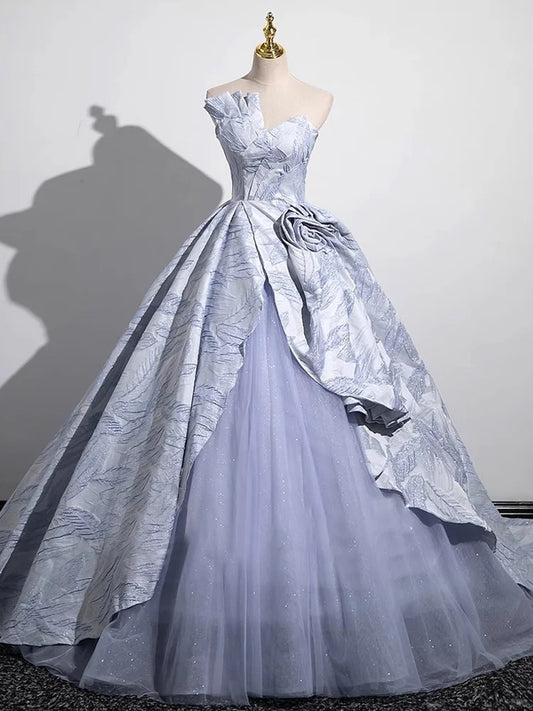 Blue Elegant Floral Long Satin Tulle Ball Gown Evening Gown Birthday Gown Wedding Dress nv4156