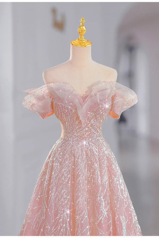 Pink Vintage Fashion Floral Beaded A-Line Long Tulle Off-Shoulder Ball Gown Quinceanera Dress Evening Gown nv4219