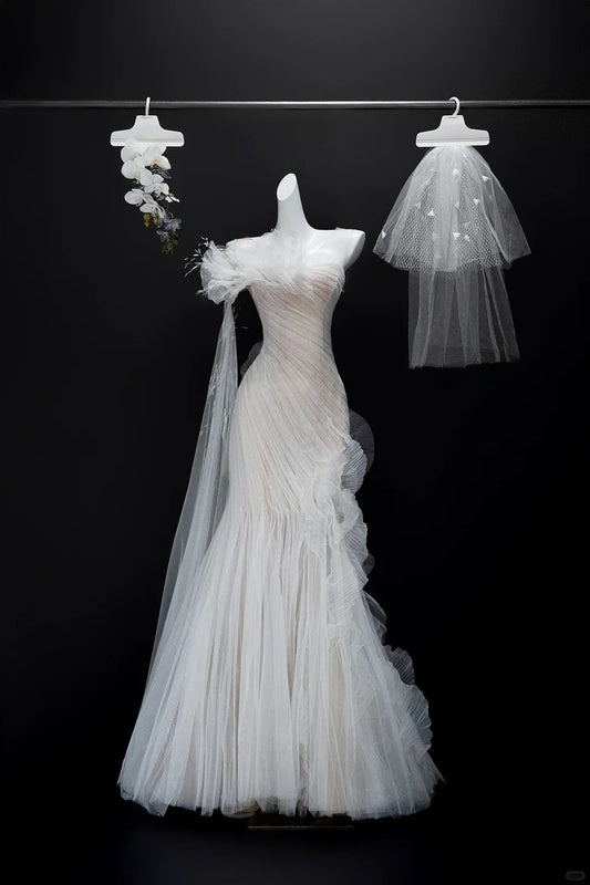 White Elegant Romantic Fashion Long Mermaid Slim Tulle Ball Gown Evening Gown Wedding Dress nv4038