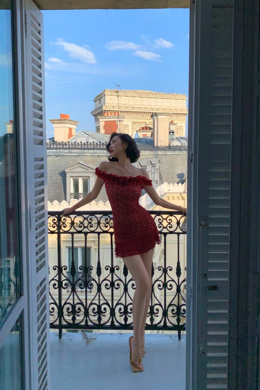 Burgundy Lace Off-the-shoulder Mini Dress: Ruffled Hem, Fitted Bodycon, French Retro Hot Girl Style NV6404