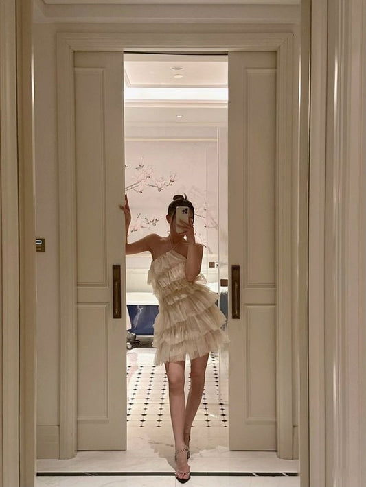 White halter ruffle short mini Homecoming Dress party dress nv2957