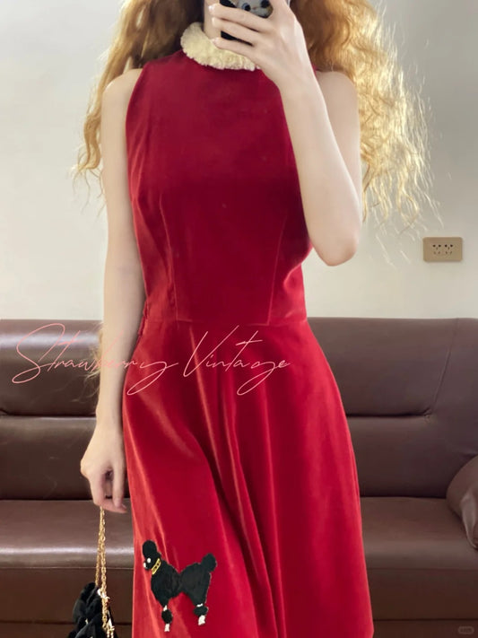 party dress birthday dress 1950s handmade vintage red velvet long dress with puppy decoration. nv5083
