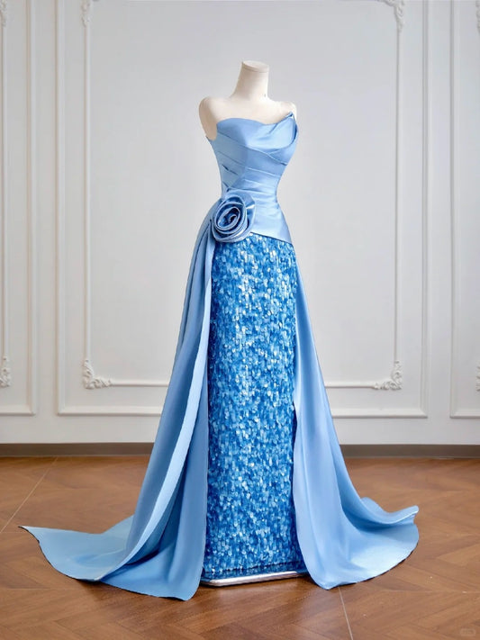 Blue shiny sequins long satin floor-length ball gown evening gown graduation dress nv5104
