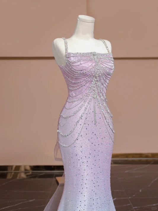 Blue Pink Glitter Beaded Ombre Long Tulle Mermaid Bodycon Floor Length Ball Gown Evening Gown Party Dress nv5054