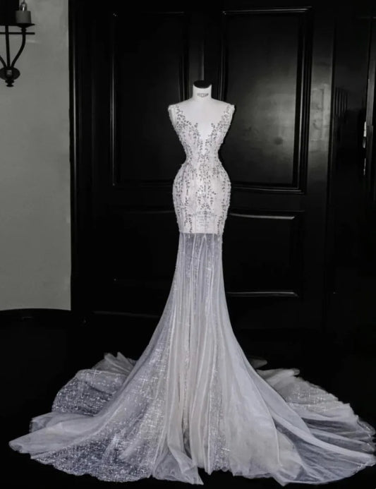 White Strapless Beaded Wedding Gown - Layered Train Ballgown Wedding/Engagement Dinner/Evening Maxi Dress NV6819