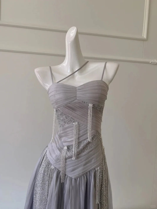 NiceVestidos – Silbergraues, schimmerndes A-Linien-Ballkleid aus Tüll mit Neckholder, Paillettenquasten und Neckholder NV5950