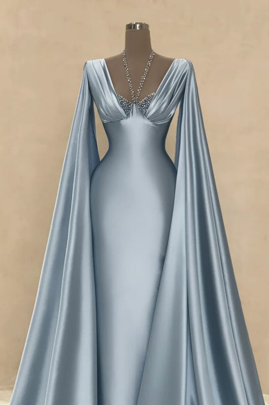 NiceVestidos – Langärmeliges, bodenlanges, blaues Satin-Abendkleid NV5952