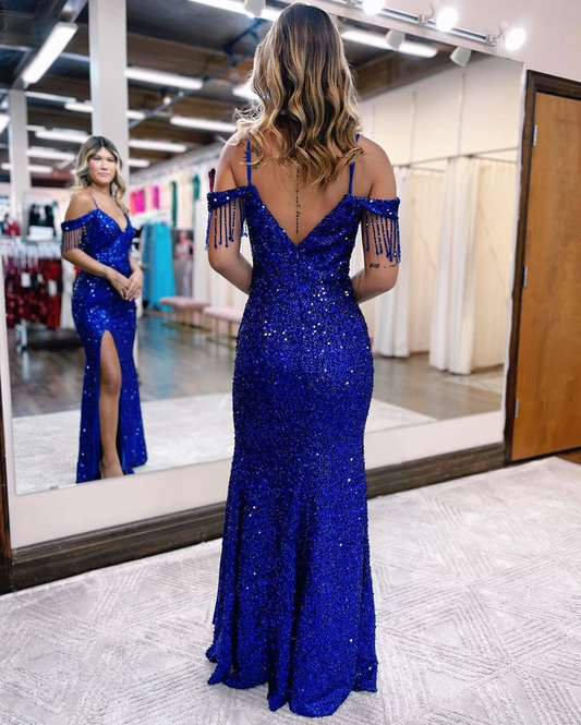 Funkelnde Meerjungfrau V-Ausschnitt Königsblau Pailletten Lange Ballkleider mit Schlitz nv465