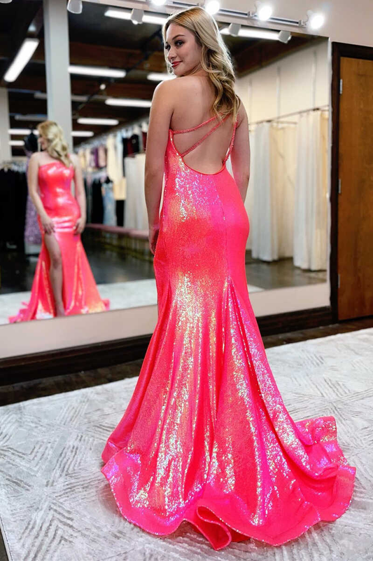 Glänzendes, rückenfreies, langes Meerjungfrauenkleid mit einer Schulter und Schlitz nv468