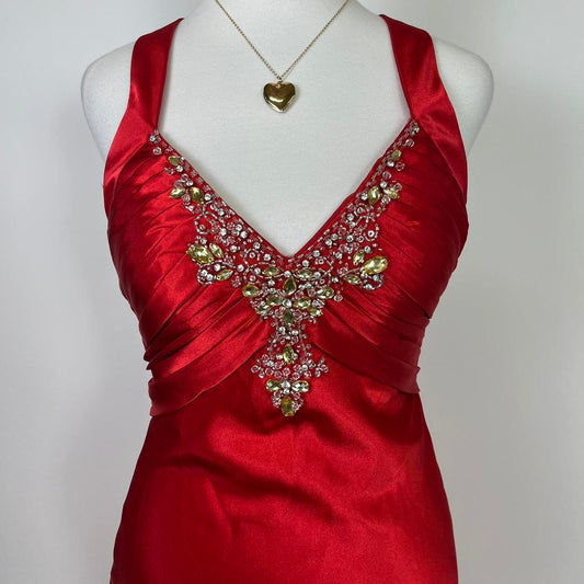 Rotes, perlenbesetztes, langes, bodenlanges Ballkleid aus Satin, nv5050