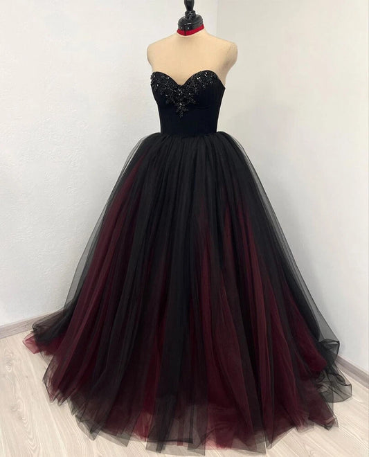 Ärmelloses, schwarz-rotes Tüllkleid mit Farbverlauf | Luxuriöses, glamouröses Cape-Kleid mit Perlenbesatz und ohne Schleppe für Galabälle NV6298
