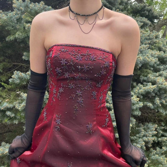 NiceVestidos-Burgunderfarbenes, ärmelloses, bodenlanges Gothic-Kleid aus Satin mit Perlenbesatz, NV6178