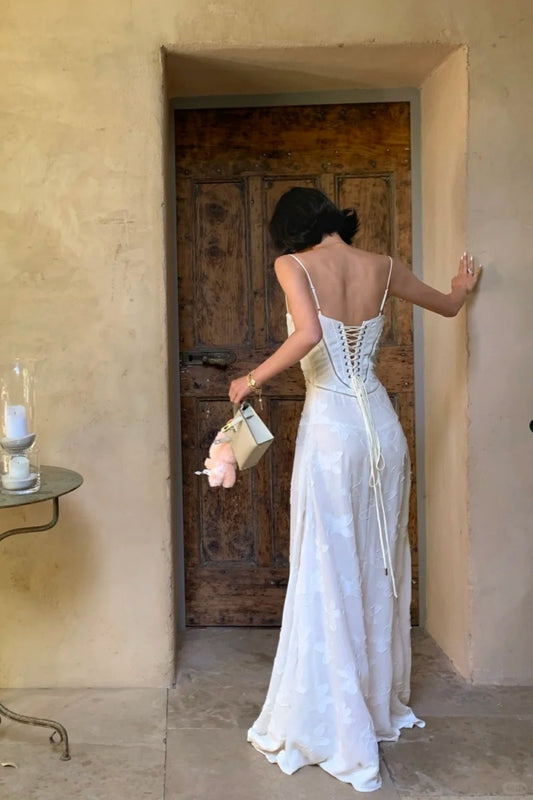 Weißes, besticktes Abendkleid: Trägerloses, rückenfreies Chiffonkleid mit dünnen Trägern, elegantes Modell NV6405