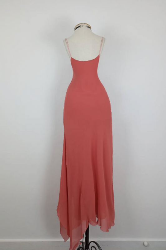 NiceVestidos – Vintage Korallenrosa Spaghettiträger-Abendkleid mit Perlenstickerei und Schlitz NV5922