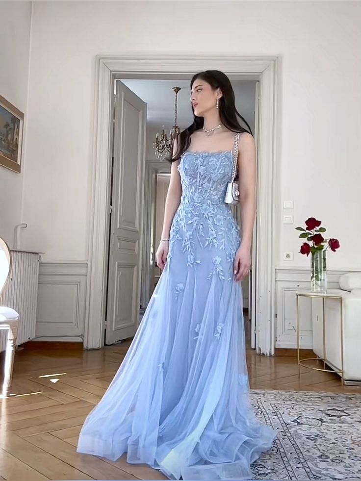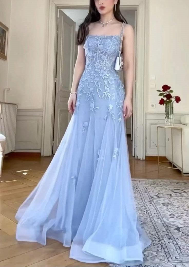 Blue stylish elegant exquisite embroidered spaghetti straps long tulle off-shoulder floor-length ball gown, evening dress, party dress nv3716