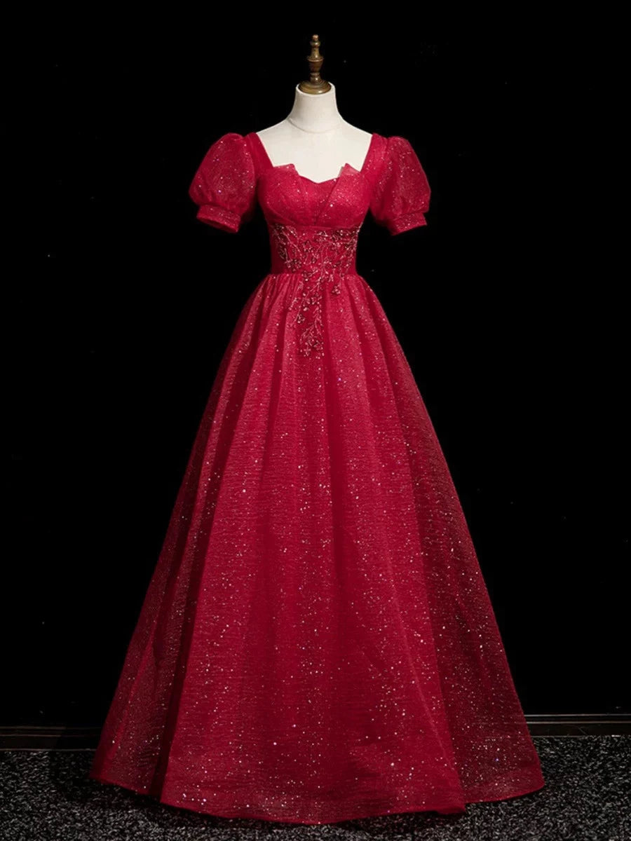 Burgundy Beaded Short Sleeve A-Line Party Dress Tulle Long Prom Dress Evening Dress nv4280